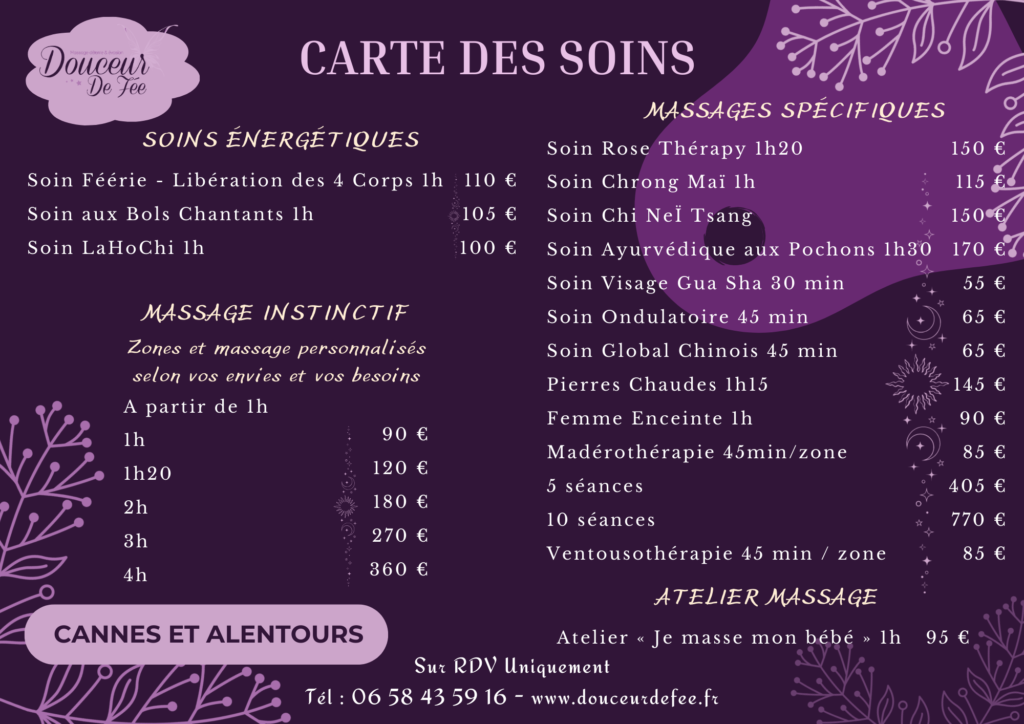 Pour bénéficier de ces massages et soins énergétiques, il suffit de me contacter par téléphone au 06 58 43 59 16 ou de vous rendre sur la page de prise de RDV ci-dessous.