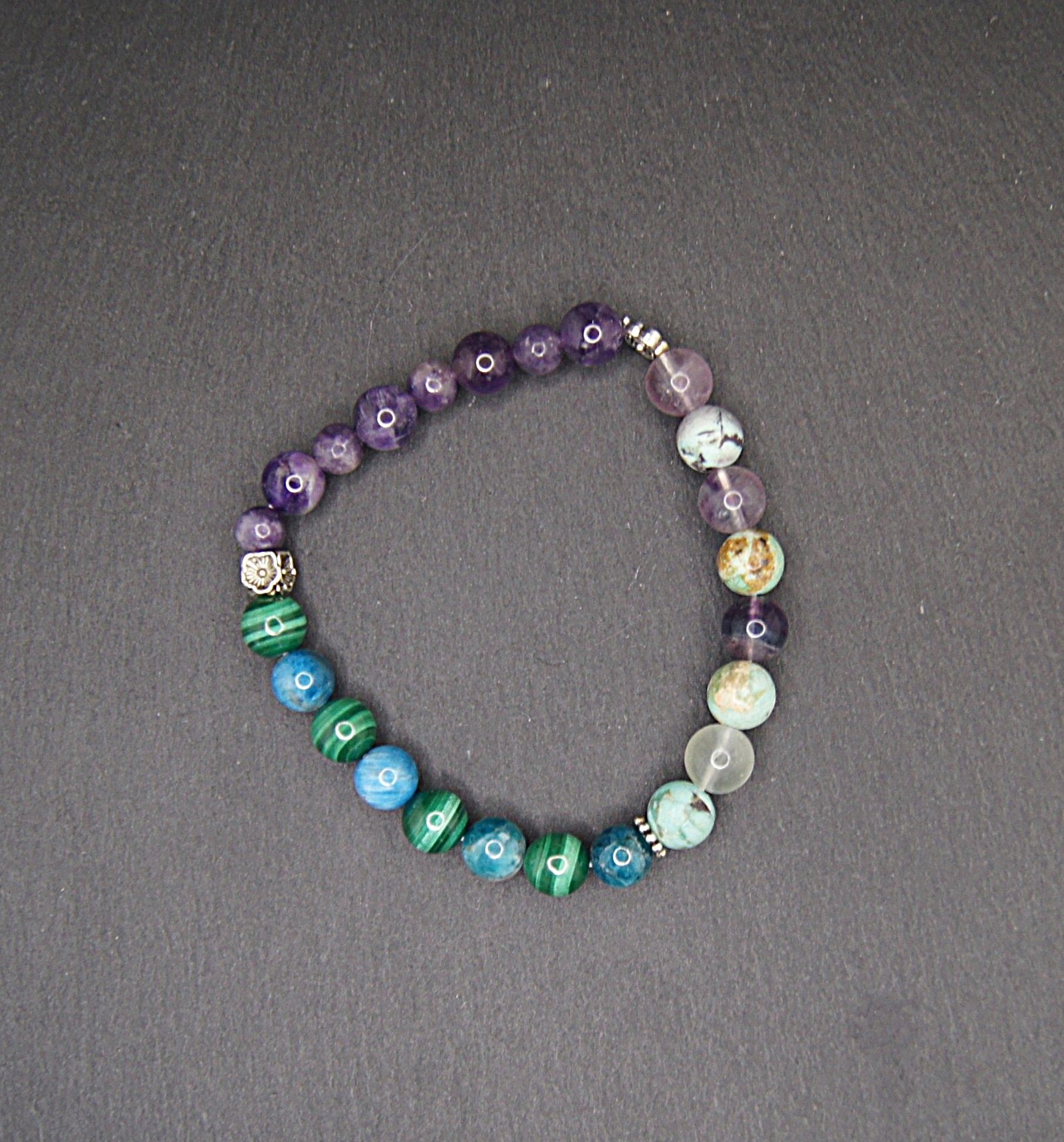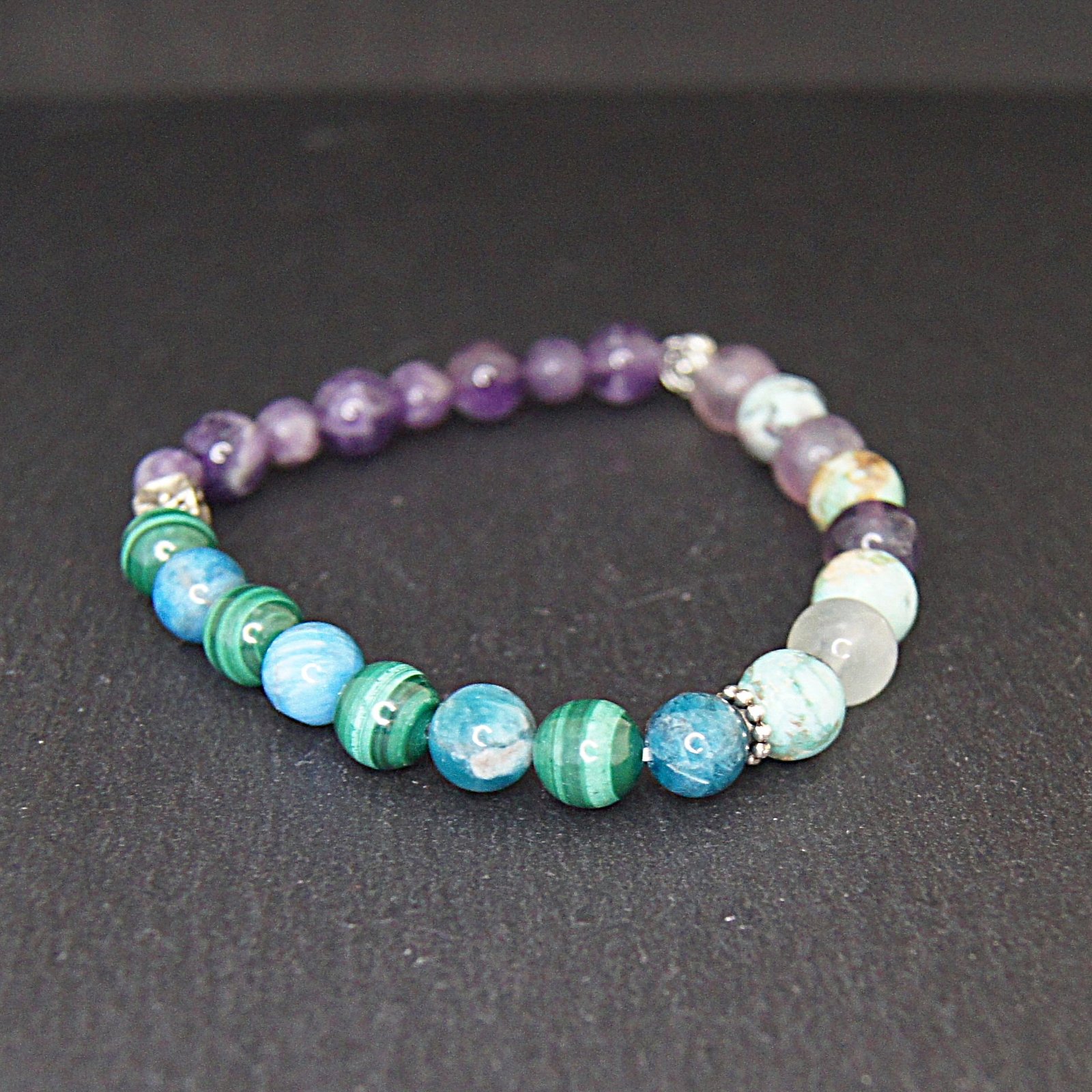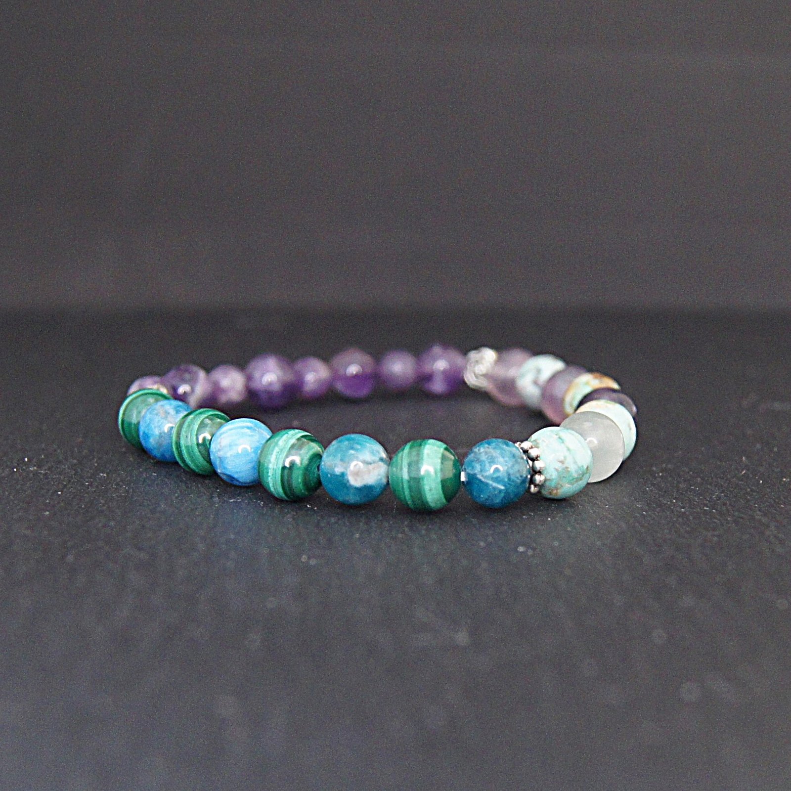 Découvrez le bracelet « Douleurs et Sommeil », un bijou exceptionnel conçu pour allier le style et le bien-être. Ce bracelet regroupe six pierres précieuses soigneusement sélectionnées : l’Améthyste, la Lépidolite, la Fluorite, l’Apatite, la Malachite et la Turquoise. Chaque pierre a été choisie pour ses propriétés naturelles contribuant à apaiser les douleurs physiques et à améliorer la qualité du sommeil.