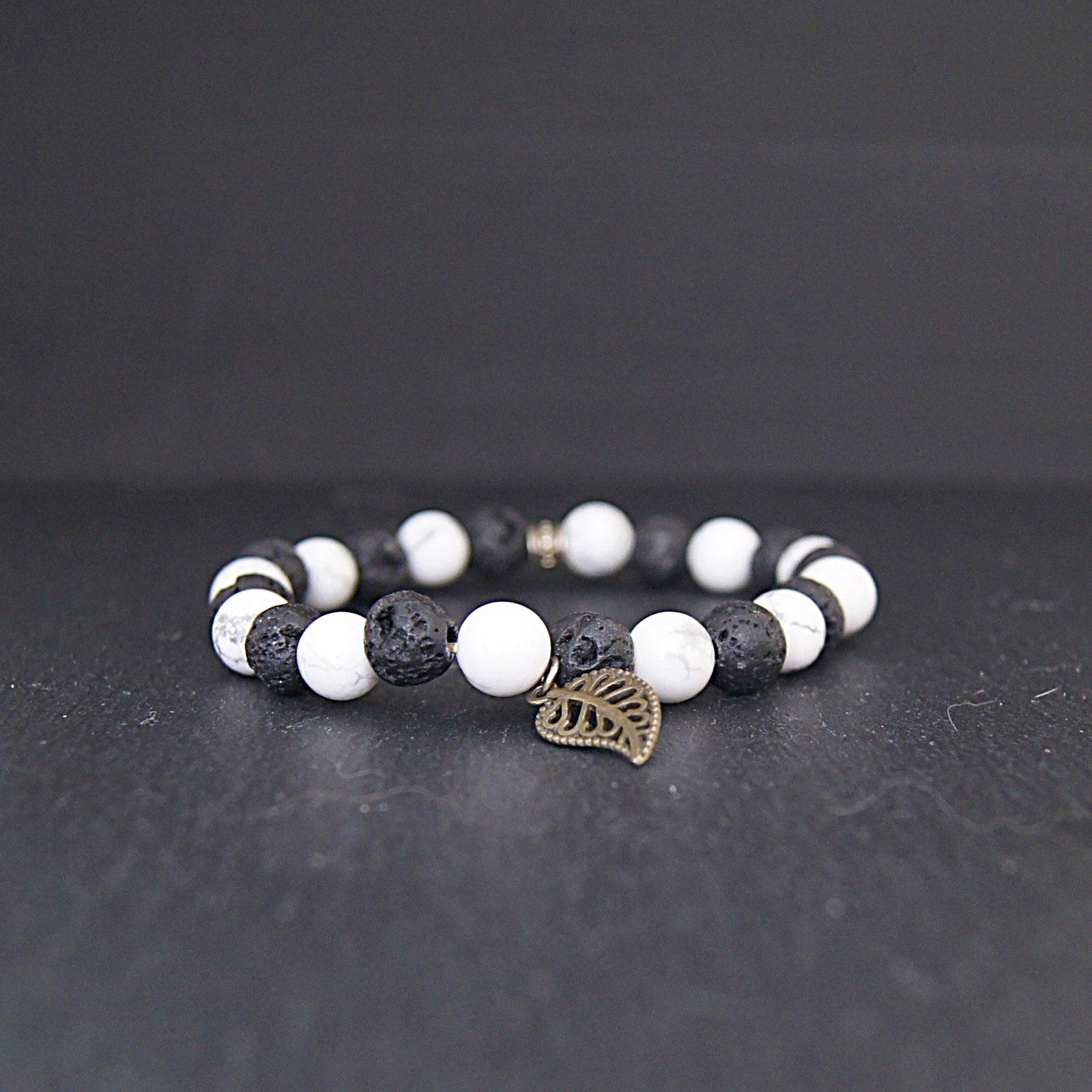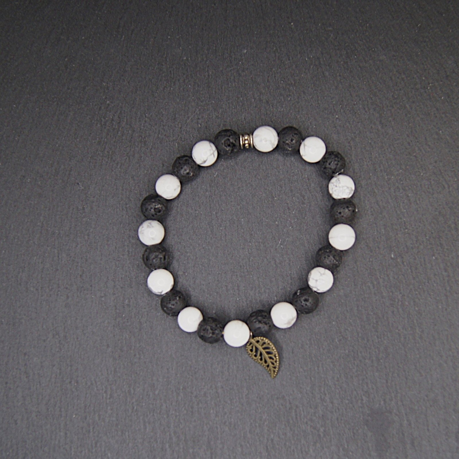 Le bracelet « Yin Yang Bronze » dispose de matériaux de haute qualité provenant avec soin. Les pierres en howlite, avec leur texture marbrée blanche distinctive, sont connues pour leurs propriétés calmantes et leur connexion à la paix intérieure. En complément de cela, il y a les pierres de lave noires naturelles, célébrées pour leurs qualités de mise à la terre et leur charme robuste subtil. Ensemble, ces éléments créent un contraste étonnant, rehaussé par le délicat détail de feuilles de bronze – une embellie subtile mais élégante.